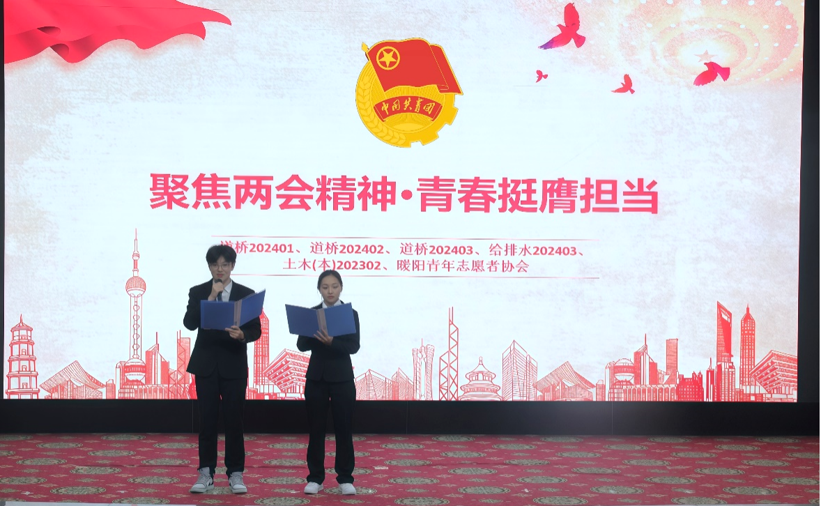 为深入学习贯彻习近平总书记在全国两会期间的重要讲话精神,聚焦用习近平新时代中国特色社会主义思想铸魂育人,把德育贯穿于智育、体育、美育、劳动教育全过程,在全面推进中国式现代化的新征程上展现新担当新作为,2025年4月15日,bwin必赢中国官网道桥(本)202401、道桥(本)202402、道桥(本)202403、给排水(本)202403、土木(本)202302团支部与暖阳青年志愿者协会在图书馆报告厅联合举办 “聚焦两会精神,青春挺膺担当”主题班团活动。