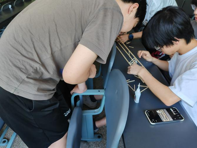 “我们组设计的是一座拱桥,拱形结构能更有效地分散压力,让桥体更加稳固。”一位同学边全神贯注地操作手中木棍,小心翼翼黏合成优雅的拱形,边向身旁好奇的同学详细阐述设计理念,言语间满是激情与创意。“我们还打算在桥面上添加一些装饰,让它不仅实用,还更加美观。”另一位同学满怀期待地补充道,眼中闪烁着对即将完成作品的热切期盼。