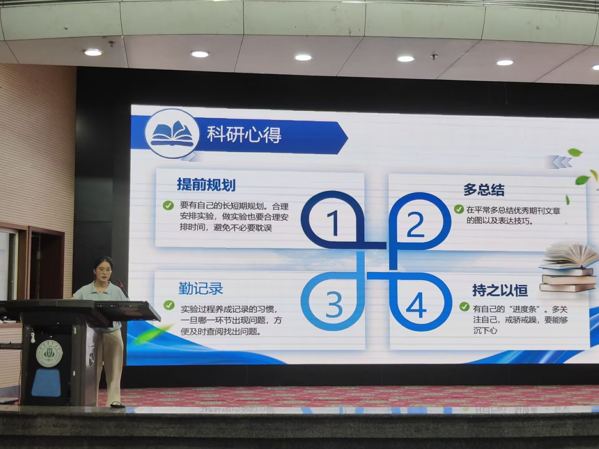 甘芮从研究背景,研究内容,科研心得三个方面为大家进行学术分享,首先聚焦“金属甲烷厌氧氧化机制及在市政污水处理的应用”,系统介绍了甲烷减排研究的技术突破。对此,甘芮同学做了大量研究,并发表了两篇SCI论文,均属中科院TOP期刊。分享中,她详细讲述了从确定研究方向、开展实验研究,到论文撰写与投稿的全流程,重点剖析了在探索金属甲烷厌氧氧化机制时遇到的难题及解决思路。她提到,科研需保持好奇心与韧性,面对复杂数据和实验挫折,要善于从文献中找灵感、在团队协作中寻支持,鼓励同学们勇于尝试跨学科研究,拓宽科研视野。