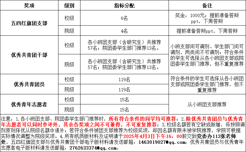 4.申请“五四红旗团支部”的团支部请自行准备3分钟答辩ppt,清明假期后将第一时间组织现场答辩。