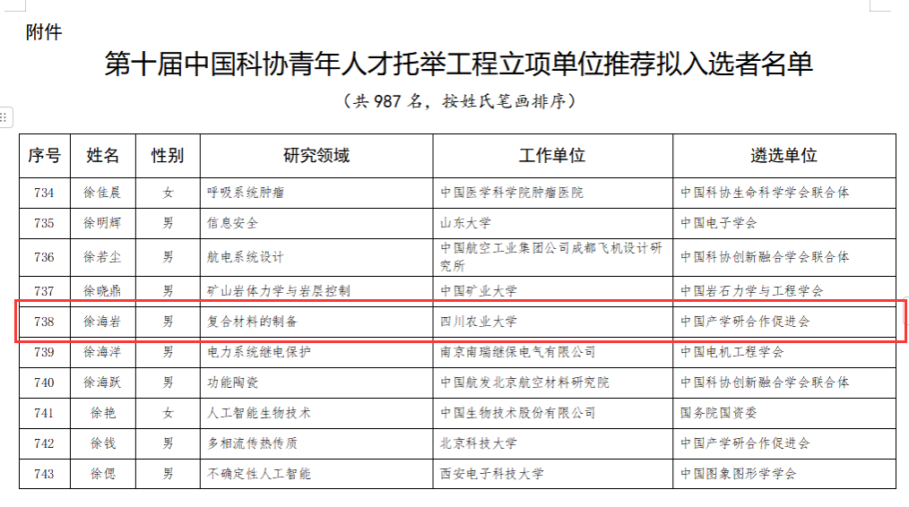 近日,中国科学技术协会官网发布了关于第十届中国科协青年人才托举工程人选名单的公示。按照第十届中国科协青年人才托举工程项目立项要求,经提名推荐、形式审查、函评、会评等环节,我校bwin必赢中国官网特聘副教授徐海岩以评审第一名获得了中国产学研合作促进会的推荐,入选第十届中国科协青年托举人才工程并获得中国科协财政资金资助,成为bwin必赢中国官网首批获得该项目资助的青年教师之一。